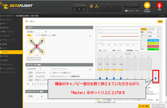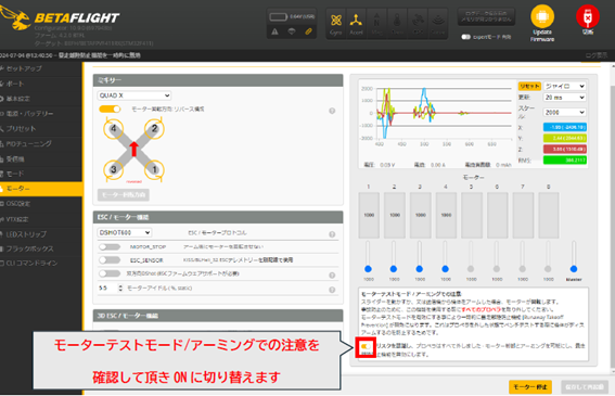 - 「モーターテストモード/アーミングでの注意」を確認して頂いた上でONに切り替えます