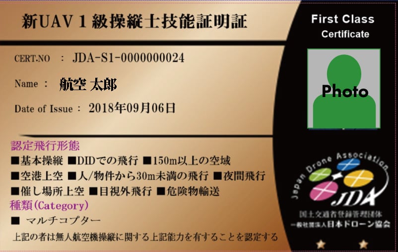 ドローンの高度な知識と技能を習得しており、講師として日本ドローン協会で教えることができる方に付与する証明証。